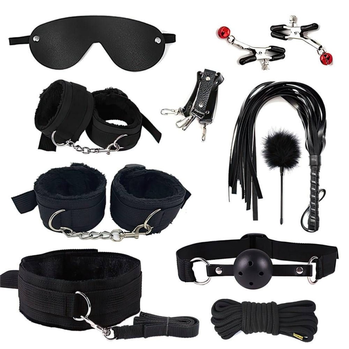 Kit Sado Bondage com 10 Peças: Mordaça, venda, coleira com guia, chicote, algemas, tornozeleiras, cruz de restrição, corda de 5 m, pluma e prendedores de mamilos. Acabamento confortável e materiais resistentes (PU, pelúcia, metal). Ideal para experiências BDSM com segurança, estilo e intensidade.