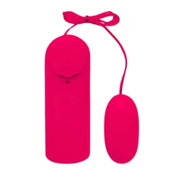 Cápsula vibratória bullet em formato bala com controle remoto com fio, tendo um único botão giratório para o controle da vibração.