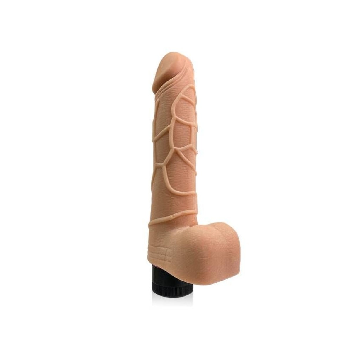 Pênis realístico 20,7 cm com vibração multivelocidade, possui glande saliente e escroto.