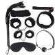 Kit bondage com 8 peças, sendo: Algema, Tornozeleira, Venda, Corda, Coleira e guia revestidas em couro sintético por fora e pelúcia por dentro.